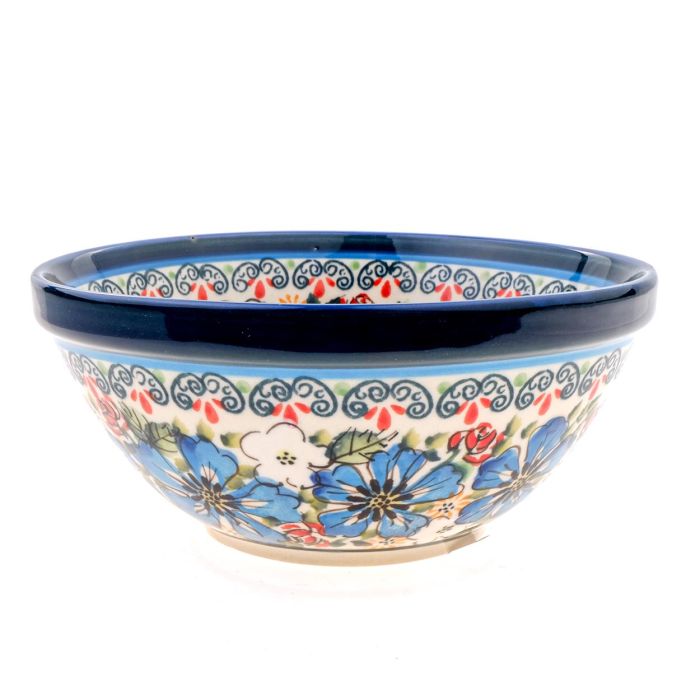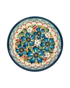 • Podobnie jak wszystkie produkty ceramiczne z Zakładów Ceramicznych "BOLESŁAWIEC", tace są ręcznie dekorowane za pomocą stempli i pędzli, dzięki czemu każda taca jest unikatowa, dlatego mogą występować minimalne różnice w dekoracji między poszczególnymi egzemplarzami w ramach tej samej dekoracjiEX-308To przykład ekskluzywnej dekoracji o charakterze artystycznym, bardzo malarskim. Cała powierzchnia ceramiki jest pokryta wzorem kwiatowym, dominowanym przez duże niebieskie kwiaty, które przypominają Klejnotki, tak popularne w ogrodach, lub hibiskus, coraz bardziej popularny tutaj. Dlaczego więc nie przynieść ulubionych kwiatów na stół w formie ceramiki, zwłaszcza że ten bukiet zawiera również róże, kwiaty truskawek i truskawki. Kontrastem dla ogrodu pełnego kolorów są grube linie kobaltu i kolorowe wzory. Dekoracja przyspiesza bicie serca.