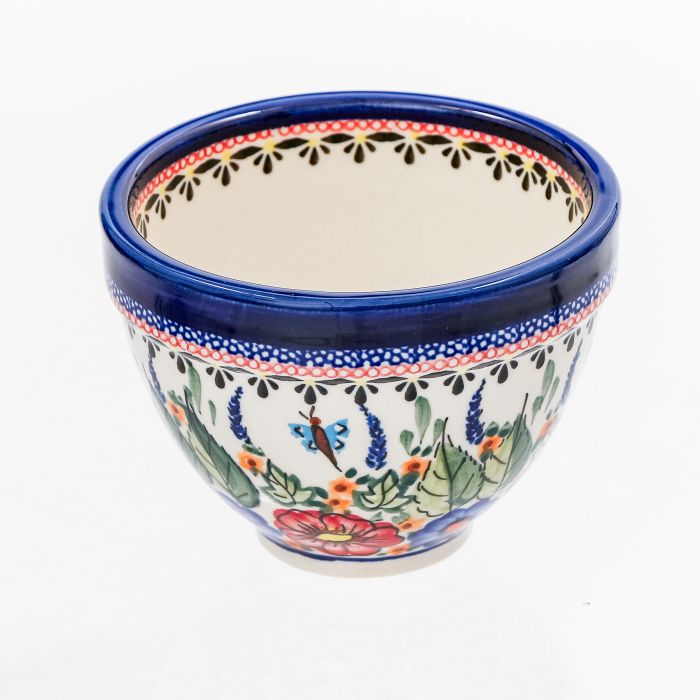 Moździerz (bez tłuczka)ART-149To jedna z unikatowych dekoracji, które charakteryzują się większą różnorodnością wzorów i kolorów niż tradycyjne dekoracje. W tym przypadku mamy motyw łąki kwiatowej lub ogrodu, po którym latają motyle przyciągnięte przez kwiaty. Użyte kolory to: kobalt, czerwony, pomarańczowy, odcienie zieleni, niebieski i brązowy. W kontraście do prawdziwie malarskiego motywu kwiatowego są szablony składające się z abstrakcyjnych wzorów. Bardzo spektakularna dekoracja.