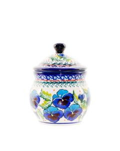 Moździerz (bez tłuczka)ART-277To jedna z unikatowych dekoracji, które charakteryzują się większą różnorodnością wzorów i kolorów niż tradycyjne dekoracje. W tym przypadku mamy do czynienia z jednym z najpiękniejszych polskich kwiatów, czyli bratkami. Zachowane w kolorach ciemnego niebieskiego z czarnymi środkami są eleganckie. W kontraście do prawdziwie malarskiego motywu kwiatowego są szkice składające się z abstrakcyjnych wzorów. Nietypowa dekoracja dla koneserów ceramiki Bolesławca.