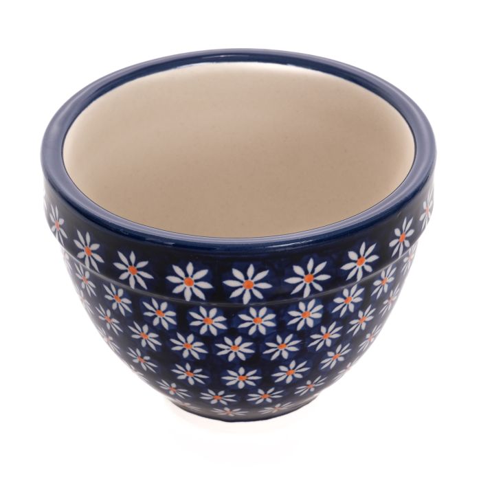 Moździerz (bez tłuczka)D-1311ATo jedna z klasycznych dekoracji bolesławieckich naczyń. Przed naszymi oczami rozpościera się zachwycający dywan z drobnych kwiatków o płatkach w kolorze kobaltu i pomarańczowych środkach. Kwiatki są nanoszone na śmietankowe tło bardzo precyzyjnie i starannie jeden przy drugim, tak że lekko stykają się płatkami. To daje niesamowity efekt. Dekoracja dla koneserów.