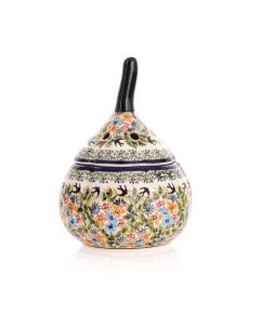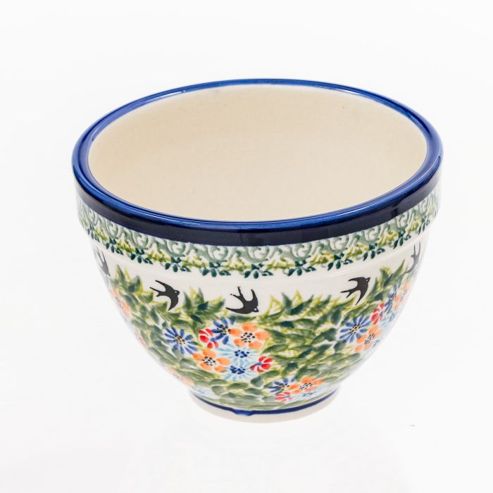 Moździerz (bez tłuczka)DU-182To jedna z unikatowych dekoracji, charakteryzujących się większą różnorodnością wzorów i kolorów niż tradycyjne motywy. Tutaj mamy kwietną łąkę, która pulsuje kolorami i kształtami. Niebieski, czerwony, pomarańczowy, kobalt, odcienie zieleni. I niespodzianka: unoszące się na horyzoncie jaskółki, zwiastuny wiosny. Piękna dekoracja będzie ozdobą każdego stołu.