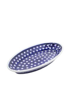 • Podobnie jak wszystkie produkty ceramiczne z Zakładów Ceramicznych "BOLESŁAWIEC", tace są ręcznie dekorowane za pomocą stempli i pędzli, dzięki czemu każda taca jest unikatowa, dlatego mogą występować minimalne różnice w dekoracji między poszczególnymi egzemplarzami w ramach tej samej dekoracjiD-42To jedna z najbardziej klasycznych i jednocześnie bardzo popularnych dekoracji w ceramice Bolesławca. Do wyboru są tu kobaltowe koła z białym środkiem i kobaltową kropką, przechodzące w kobaltową chmurę. Białe koła są gęsto i przypadkowo rozmieszczone. Wydają się uporządkowane, a jednak trochę przypadkowe. Barwy używane do dekoracji czynią ją minimalistyczną i elegancką.