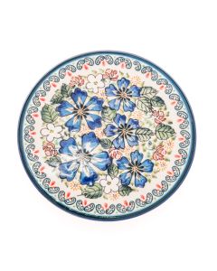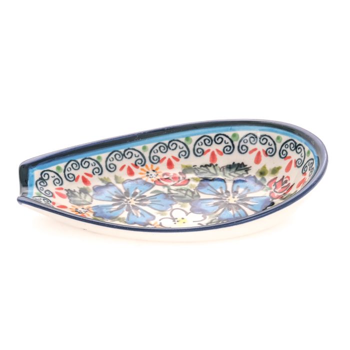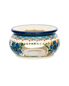 • Podobnie jak wszystkie produkty ceramiczne z Zakładów Ceramicznych "BOLESŁAWIEC", tace są ręcznie dekorowane za pomocą stempli i pędzli, dzięki czemu każda taca jest unikatowa, dlatego mogą występować minimalne różnice w dekoracji między poszczególnymi egzemplarzami w ramach tej samej dekoracjiEX-308To przykład ekskluzywnej dekoracji o charakterze artystycznym, bardzo malarskim. Cała powierzchnia ceramiki jest pokryta wzorem kwiatowym, dominowanym przez duże niebieskie kwiaty, które przypominają Klejnotki, tak popularne w ogrodach, lub hibiskus, coraz bardziej popularny tutaj. Dlaczego więc nie przynieść ulubionych kwiatów na stół w formie ceramiki, zwłaszcza że ten bukiet zawiera również róże, kwiaty truskawek i truskawki. Kontrastem dla ogrodu pełnego kolorów są grube linie kobaltu i kolorowe wzory. Dekoracja przyspiesza bicie serca.