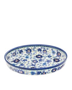 • Podobnie jak cała oferta produktów Zakładów Ceramicznych "BOLESŁAWIEC", talerze są również ręcznie dekorowane za pomocą stempli i pędzli, dzięki czemu każdy jest unikatowy, dlatego mogą występować minimalne różnice w dekoracji między poszczególnymi egzemplarzami tej samej dekoracjiDU-126To jedna z unikatowych dekoracji, które charakteryzują się większą różnorodnością wzorów i kolorów niż tradycyjne motywy. Mamy tu cztery odcienie zieleni, kobalt, odcienie niebieskiego. Dekoracja przywołuje na myśl letnią łąkę, gdzie nie brakuje kształtów i kolorów. Ta bogactwo jest wyważane przez kobaltowe linie na krawędziach. Niemożliwe jest oderwanie wzroku.