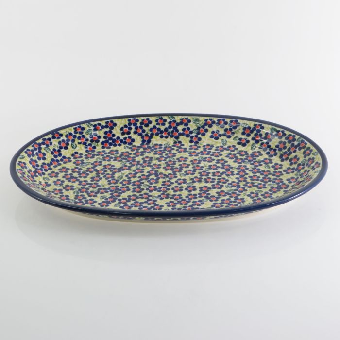 • Podobnie jak cała oferta Zakładów Ceramicznych „BOLESŁAWIEC”, również patery zdobione są ręcznie przy użyciu stempli i pędzli, dzięki czemu każdy z nich jest niepowtarzalny, dlatego mogą występować minimalne różnice w dekoracji pomiędzy poszczególnymi egzemplarzami w ramach tej samej dekoracjiDU-206To jedna z unikatowych dekoracji, charakteryzujących się większą różnorodnością wzorów i kolorów niż w przypadku tradycyjnych dekoracji. Kobalt, tak charakterystyczny dla ceramiki bolesławieckiej, dominuje tutaj. Tym razem w formie małych kwiatów z pięcioma płatkami. Między nimi znajdują się liście w różnych odcieniach zieleni. Klasyczna ceramiczna elegancja w edycji kwiatowej.