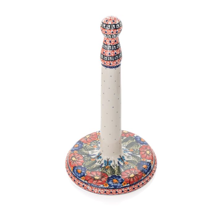 Stojak na ręcznikART-149To jedna z unikatowych dekoracji, które charakteryzują się większą różnorodnością wzorów i kolorów niż tradycyjne dekoracje. W tym przypadku mamy motyw łąki kwiatowej lub ogrodu, po którym latają motyle przyciągnięte przez kwiaty. Użyte kolory to: kobalt, czerwony, pomarańczowy, odcienie zieleni, niebieski i brązowy. W kontraście do prawdziwie malarskiego motywu kwiatowego są szablony składające się z abstrakcyjnych wzorów. Bardzo spektakularna dekoracja.