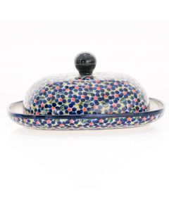 Stojak na ręcznikDU-206To jedna z unikatowych dekoracji, charakteryzujących się większą różnorodnością wzorów i kolorów niż w przypadku tradycyjnych dekoracji. Kobalt, tak charakterystyczny dla ceramiki bolesławieckiej, dominuje tutaj. Tym razem w formie małych kwiatów z pięcioma płatkami. Między nimi znajdują się liście w różnych odcieniach zieleni. Klasyczna ceramiczna elegancja w edycji kwiatowej.
