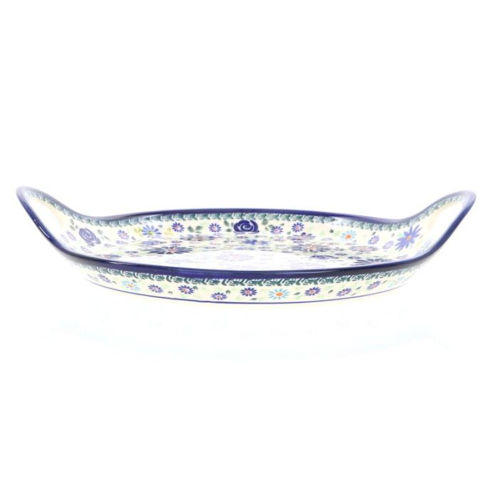 Tacka z uchami (33,5CM)DU-126To jedna z unikatowych dekoracji, które charakteryzują się większą różnorodnością wzorów i kolorów niż tradycyjne motywy. Mamy tu cztery odcienie zieleni, kobalt, odcienie niebieskiego. Dekoracja przywołuje na myśl letnią łąkę, gdzie nie brakuje kształtów i kolorów. Ta bogactwo jest wyważane przez kobaltowe linie na krawędziach. Niemożliwe jest oderwanie wzroku.