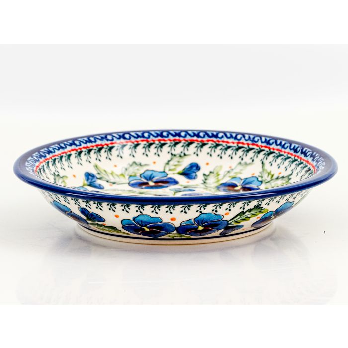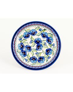 • Podobnie jak cała oferta produktów Zakładów Ceramicznych "BOLESŁAWIEC", talerze są również ręcznie dekorowane za pomocą stempli i pędzli, dzięki czemu każdy jest unikatowy, dlatego mogą występować minimalne różnice w dekoracji między poszczególnymi egzemplarzami tej samej dekoracjiART-277To jedna z unikatowych dekoracji, które charakteryzują się większą różnorodnością wzorów i kolorów niż tradycyjne dekoracje. W tym przypadku mamy do czynienia z jednym z najpiękniejszych polskich kwiatów, czyli bratkami. Zachowane w kolorach ciemnego niebieskiego z czarnymi środkami są eleganckie. W kontraście do prawdziwie malarskiego motywu kwiatowego są szkice składające się z abstrakcyjnych wzorów. Nietypowa dekoracja dla koneserów ceramiki Bolesławca.