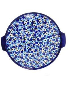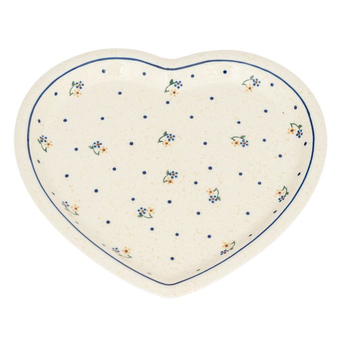 Talerz serce (27,4x25CM)D-111Charakterystycznym elementem wzoru jest delikatna gałązka z kwiatkami. Na zielonych gałązkach z listkiem są dwa drobne, geometryczne kwiatki: żółty i niebieski, każdy z brązowym środkiem. Element rozłożony jest symetrycznie na żółtym, marmurkowym tle. Dopełnieniem są drobne, granatowe kropki, rozrzucone luźno pomiędzy kwiatkami. To jedna z naszych ponadczasowych dekoracji.