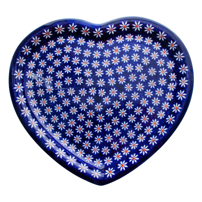 Talerz serce (27,4x25CM)D-1311ATo jedna z klasycznych dekoracji bolesławieckich naczyń. Przed naszymi oczami rozpościera się zachwycający dywan z drobnych kwiatków o płatkach w kolorze kobaltu i pomarańczowych środkach. Kwiatki są nanoszone na śmietankowe tło bardzo precyzyjnie i starannie jeden przy drugim, tak że lekko stykają się płatkami. To daje niesamowity efekt. Dekoracja dla koneserów.