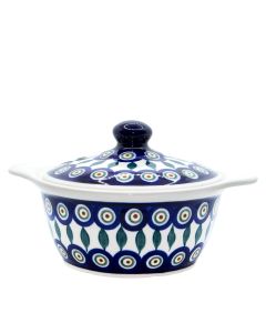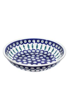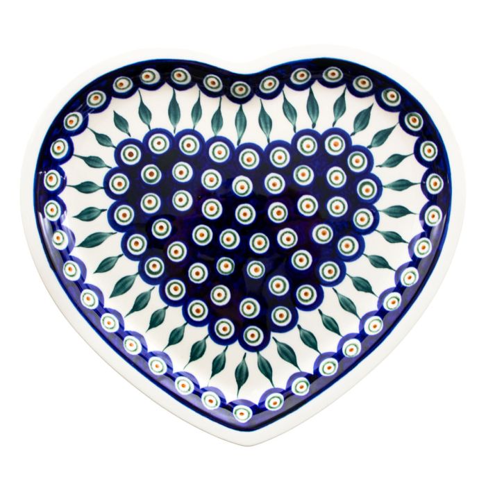 Talerz serce (27,4x25CM)D-56Jedna z najstarszych i najbardziej klasycznych dekoracji Zakładów Ceramicznych „BOLESŁAWIEC” łącząca stemple w charakterystycznym wzorze „pawiego oczka” z ręcznie malowanymi listkami. Metoda stempelkowa to tradycyjna technika zdobienia naczyń sięgająca 1882 roku, kiedy to miejscowi garncarze wynaleźli dekorację wykonywaną za pomocą gąbki z użyciem farb podszkliwnych w intensywnych barwach kobaltu i zieleni. Mimo upływu wielu lat ta forma zdobienia pozostaje niezmiennie popularna wśród współczesnych miłośników ceramiki bolesławieckiej.