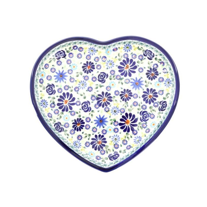 Talerz serce (27,4x25CM)DU-126To jedna z unikatowych dekoracji, które charakteryzują się większą różnorodnością wzorów i kolorów niż tradycyjne motywy. Mamy tu cztery odcienie zieleni, kobalt, odcienie niebieskiego. Dekoracja przywołuje na myśl letnią łąkę, gdzie nie brakuje kształtów i kolorów. Ta bogactwo jest wyważane przez kobaltowe linie na krawędziach. Niemożliwe jest oderwanie wzroku.