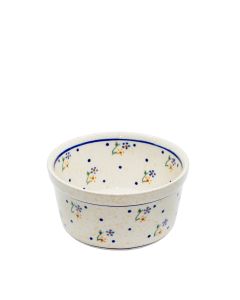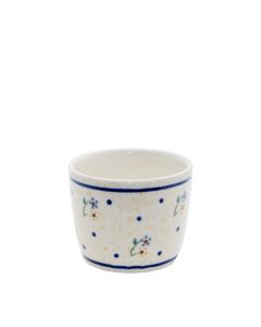 • Podobnie jak cała oferta Zakładów Ceramicznych „BOLESŁAWIEC”, również talerze zdobione są ręcznie przy użyciu stempli i pędzli, dzięki czemu każdy jest niepowtarzalny, dlatego mogą wystąpić minimalne różnice w dekoracji pomiędzy poszczególnymi egzemplarzami w ramach tej samej dekoracjiD-111Charakterystycznym elementem wzoru jest delikatna gałązka z kwiatkami. Na zielonych gałązkach z listkiem są dwa drobne, geometryczne kwiatki: żółty i niebieski, każdy z brązowym środkiem. Element rozłożony jest symetrycznie na żółtym, marmurkowym tle. Dopełnieniem są drobne, granatowe kropki, rozrzucone luźno pomiędzy kwiatkami. To jedna z naszych ponadczasowych dekoracji.
