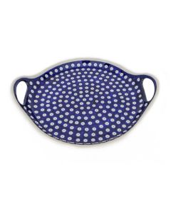 • Podobnie jak cała oferta Zakładów Ceramicznych „BOLESŁAWIEC”, również talerze zdobione są ręcznie przy użyciu stempli i pędzli, dzięki czemu każdy jest niepowtarzalny, dlatego mogą wystąpić minimalne różnice w dekoracji pomiędzy poszczególnymi egzemplarzami w ramach tej samej dekoracjiD-42To jedna z najbardziej klasycznych i jednocześnie bardzo popularnych dekoracji w ceramice Bolesławca. Do wyboru są tu kobaltowe koła z białym środkiem i kobaltową kropką, przechodzące w kobaltową chmurę. Białe koła są gęsto i przypadkowo rozmieszczone. Wydają się uporządkowane, a jednak trochę przypadkowe. Barwy używane do dekoracji czynią ją minimalistyczną i elegancką.