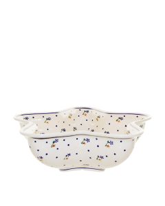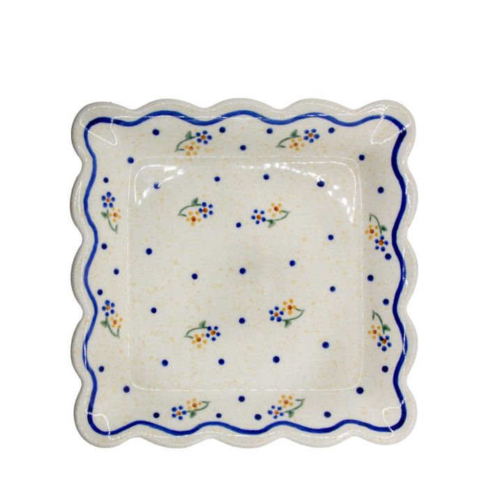 • Podobnie jak cała oferta Zakładów Ceramicznych „BOLESŁAWIEC”, również talerze zdobione są ręcznie przy użyciu stempli i pędzli, dzięki czemu każdy jest niepowtarzalny, dlatego mogą wystąpić minimalne różnice w dekoracji pomiędzy poszczególnymi egzemplarzami w ramach tej samej dekoracjiD-111Charakterystycznym elementem wzoru jest delikatna gałązka z kwiatkami. Na zielonych gałązkach z listkiem są dwa drobne, geometryczne kwiatki: żółty i niebieski, każdy z brązowym środkiem. Element rozłożony jest symetrycznie na żółtym, marmurkowym tle. Dopełnieniem są drobne, granatowe kropki, rozrzucone luźno pomiędzy kwiatkami. To jedna z naszych ponadczasowych dekoracji.