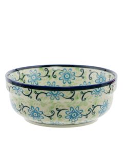 • Podobnie jak cała oferta produktów Zakładów Ceramicznych "BOLESŁAWIEC", talerze są również ręcznie dekorowane za pomocą stempli i pędzli, dzięki czemu każdy jest unikatowy, dlatego mogą występować minimalne różnice w dekoracji między poszczególnymi egzemplarzami tej samej dekoracjiA-1198ATo dekoracja dla tych, którzy lubią wzory kwiatowe, jednak nie w sielskim, ale nowoczesnym, uproszczonym wydaniu. Są niebieskie kwiaty wynurzające się z plątaniny drobnych zielonych listków i wąsów czepnych. Uroczy rozgardiasz tonuje nieco ciemny rant naczyń.