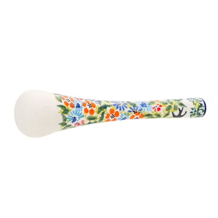 Tłuczek do moździerzaDU-182To jedna z unikatowych dekoracji, charakteryzujących się większą różnorodnością wzorów i kolorów niż tradycyjne motywy. Tutaj mamy kwietną łąkę, która pulsuje kolorami i kształtami. Niebieski, czerwony, pomarańczowy, kobalt, odcienie zieleni. I niespodzianka: unoszące się na horyzoncie jaskółki, zwiastuny wiosny. Piękna dekoracja będzie ozdobą każdego stołu.
