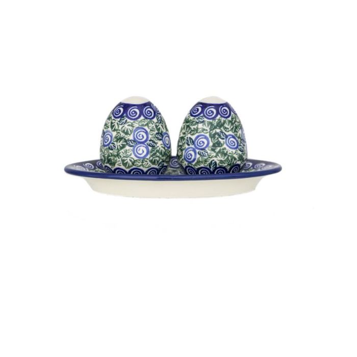 Zestaw do przyprawA-1073AKobalt, błękit i dwie odcienie niebieskiego. Czy ta dekoracja to raczej ślimaki, czy może róże - albo może i to, i to? Ślimaki w roli tzw. "ołowek pawia" na brzegu naczynia, a niebieskie róże wśród liści. To dekoracja dla tych, którzy lubią, gdy wzór wypełnia każdą wolną przestrzeń. I dla tych, którzy wolą uproszczone, stemplowane dekoracje od malowanych.