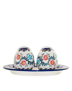 Zestaw do przyprawA-166ATa dekoracja jest królową wśród dekoracji - podziwianą i kochaną przez klientów. Pomysł na nią oparty jest na klasycznych dekoracjach Bolesławca, gdzie mamy trzy kolory: kobalt, brąz i zielony. Znajdują się tu również kobaltowe, gęsto rozmieszczone koła z oczami pawia, przechodzące w kobaltową chmurę. Są one oddzielone girlandą kwiatów o nieco poszarpanych płatkach, które trochę przypominają goździki brodate z ogrodów naszych babć i mam.