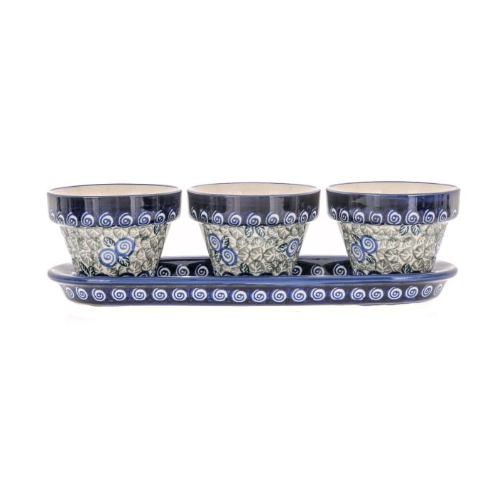 Zestaw - trzy doniczki z podstawkąA-1073AKobalt, błękit i dwie odcienie niebieskiego. Czy ta dekoracja to raczej ślimaki, czy może róże - albo może i to, i to? Ślimaki w roli tzw. "ołowek pawia" na brzegu naczynia, a niebieskie róże wśród liści. To dekoracja dla tych, którzy lubią, gdy wzór wypełnia każdą wolną przestrzeń. I dla tych, którzy wolą uproszczone, stemplowane dekoracje od malowanych.