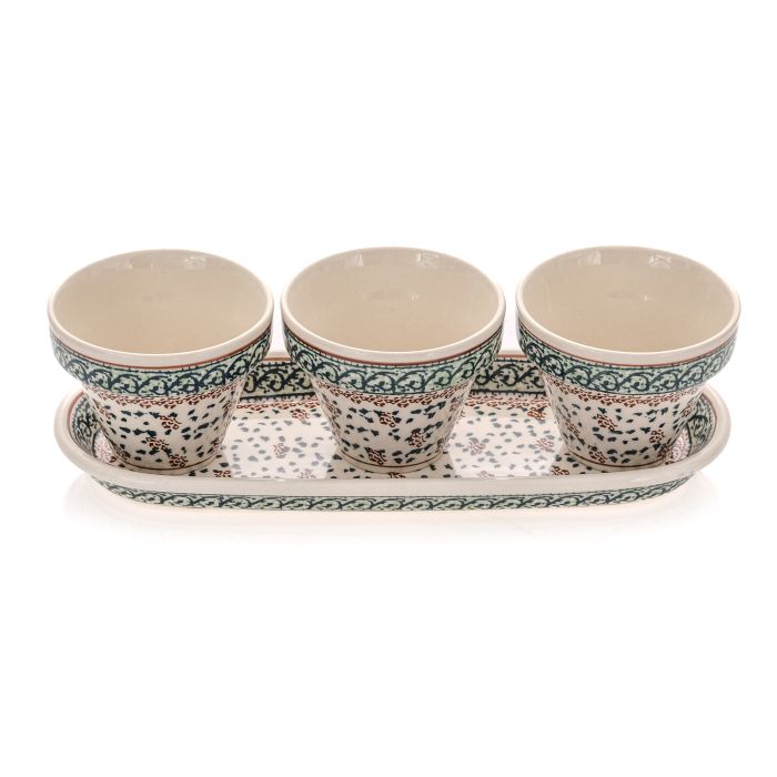 Zestaw - trzy doniczki z podstawką D-1096Ceramika z tą dekoracją na pewno nie jest nudna. Jej kolory nawiązują do tradycyjnych dekoracji Bolesławca, w których dominują kolor kobaltowy, zielony i brązowy. Jednak tutaj to nie kobalt, ale brąz odgrywa pierwsze skrzypce. Na ceramice widoczne są linie w trzech odcieniach zieleni i brązu, biegnące wokół naczynia. Całość uzupełniają plamki kobaltu, w których trudno dostrzec jakąkolwiek regularność. Tło przypomina plamiste jaja ptaków. Można się w tym zakochać.