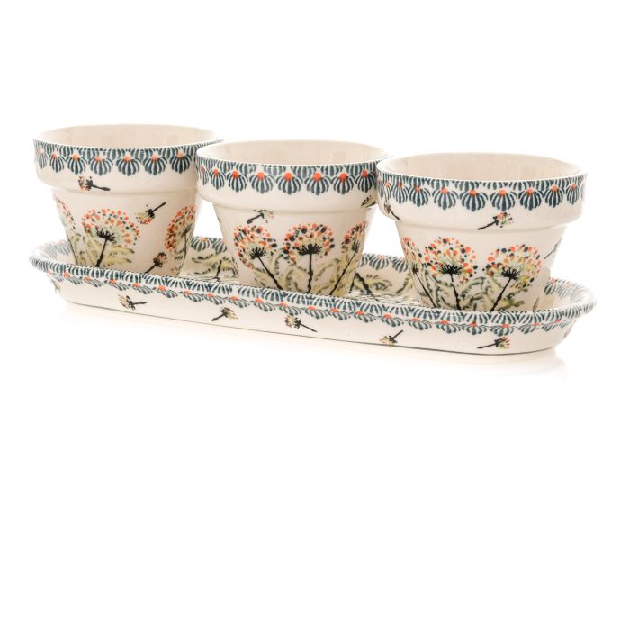 Zestaw - trzy doniczki z podstawką DU-201To jedna z unikatowych dekoracji, charakteryzujących się większą różnorodnością wzorów i kolorów niż tradycyjne motywy. Wymagający miłośnicy ceramiki Bolesławca zauważą tu kwiaty, ale czy można je zidentyfikować jako pewne gatunki z naszych ogrodów, czy są to raczej rośliny z marzeń? Nie są to ani mlecze, ani mimozy. Z czym kojarzą się Tobie?